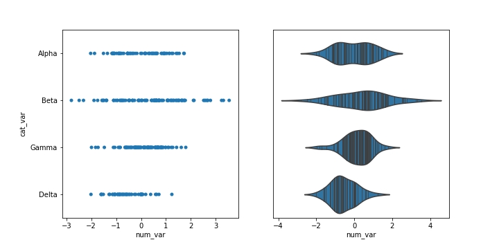 plt.ylim(ax1.get_ylim()) # set y-axis limits to be same as left plotLooking at the plots side by side, you can see relative pros and cons of the swarm plot. Unlike the violin plot and box plot, every point is plotted, so we can now compare the frequency of each group in the same plot. While there is some distortion due to location jitter, we also have a more concrete picture of where the points actually lie, removing the long tails that can be present in violin plots.