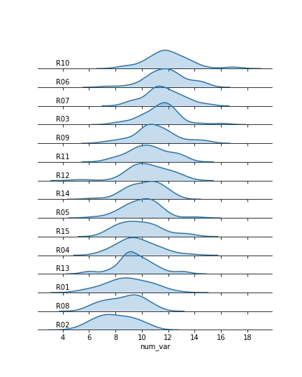 Now we've got all of the group distributions stacked on top of one another for a uni-dimensional comparison, but the plot's still pretty tall. Next, we'll create some overlap between the individual subplots.